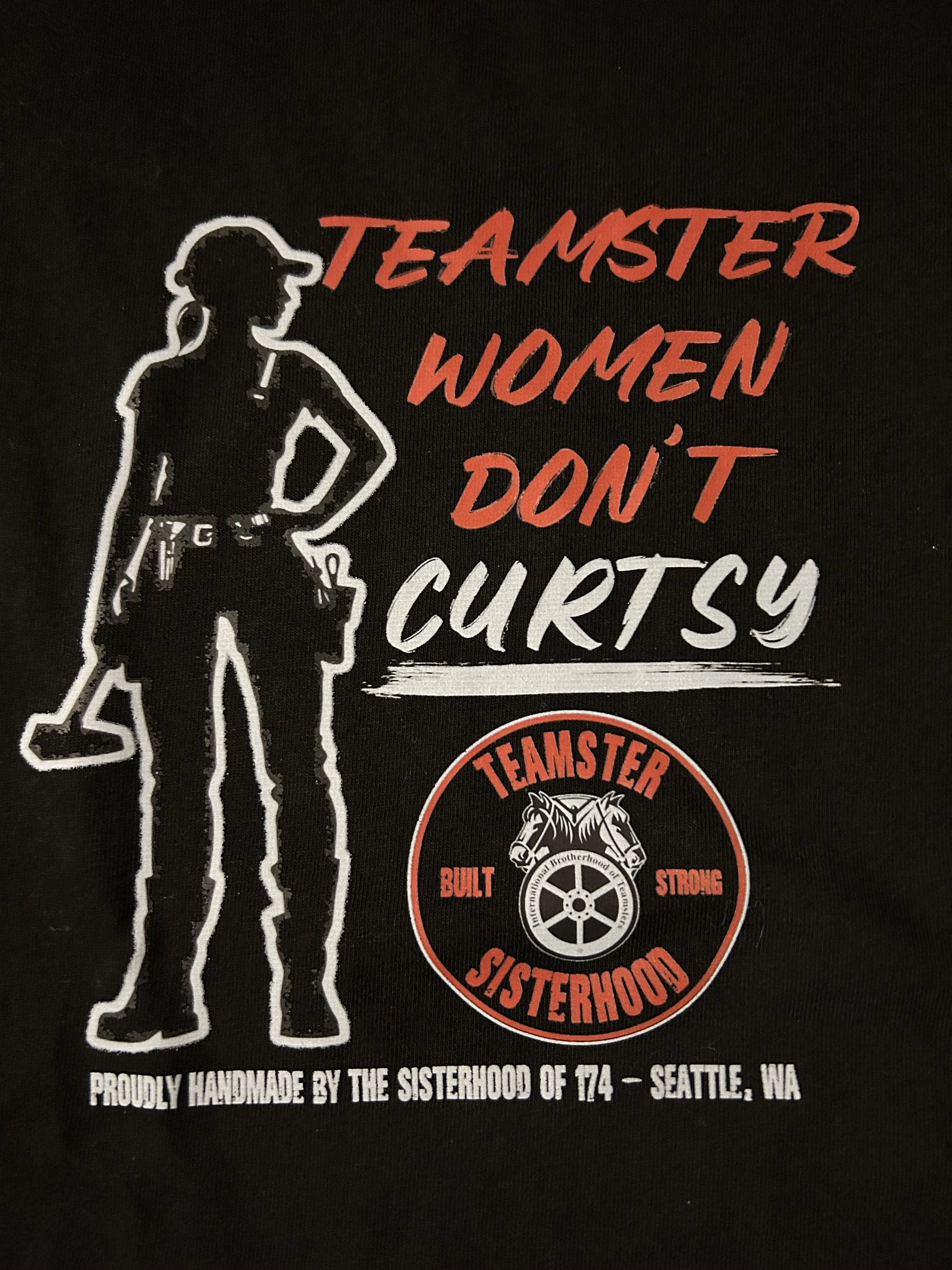 “Teamster Women Don’t Curtsy” Bayside T-Shirt with optional Toronto Women’s Conference image on back: